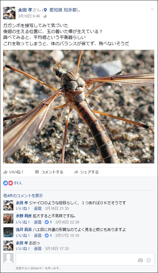 ガガンボの平均棍という平衡器 ※ 2017(H29)年4月7日 アップ(榊原正躬) 私ごとですが… 時間のあるとき、ふと、思い出して、フェースブックを見る。 素晴らしい写真と「ナルホドそうなのか…」と思えるコメントがある。中には、これは是非とも(知多自然観察会の)会員にも紹介したいと感じるものに出会う。 下記掲載記事はその一つです。ご覧ください(しんご君のコメントが凄い)。 ※ 当事者から私のところへは何ら連絡は来てないので…当然、私の勝手な判断での掲載です。