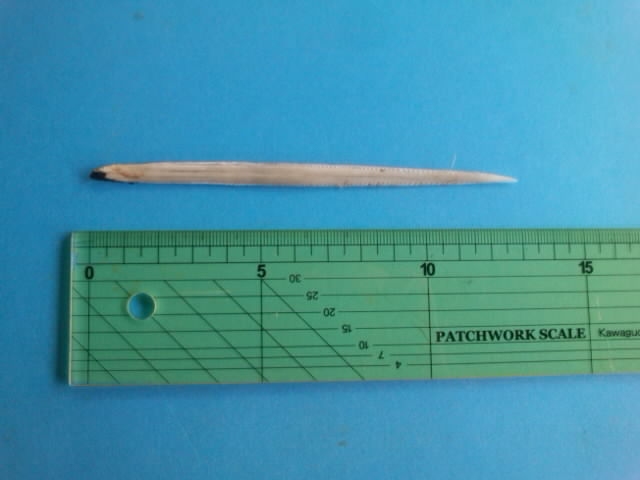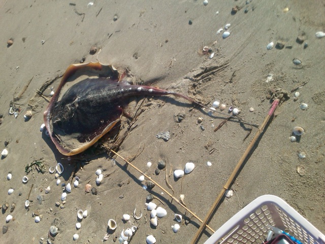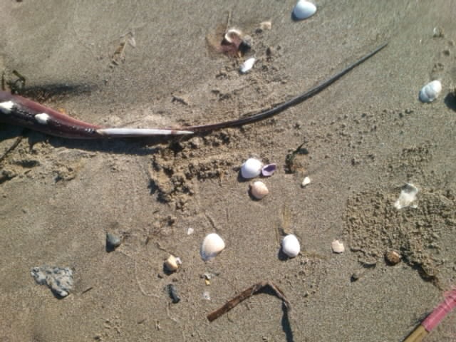 8月13日蒲池海岸で 孫と遊んでいて 打ちあがったエイを見つけました。 エイは直径30センチはありました。 針は13センチほどあります。 7月」22日のチッタナポリで 門脇さんの娘さんが、拾った骨と同じ。 あの時 彼女に小学生になりすまして、「NHKの夏休み子供科学電話相談」にしてみてわ? などと言っていた 鳥のあごの骨?など・・・。 森下さん夫妻ともその話をしていました。 先日の海の観察会でひろった骨、エイの針 でした。 中井三従美