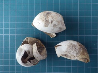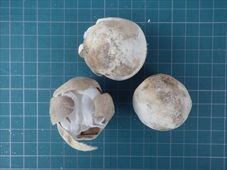 【左・中】孵化した卵の殻を3つ、取り出して撮影     【右】同左の卵の殻にティッシュペーパーを詰めて撮影したもの