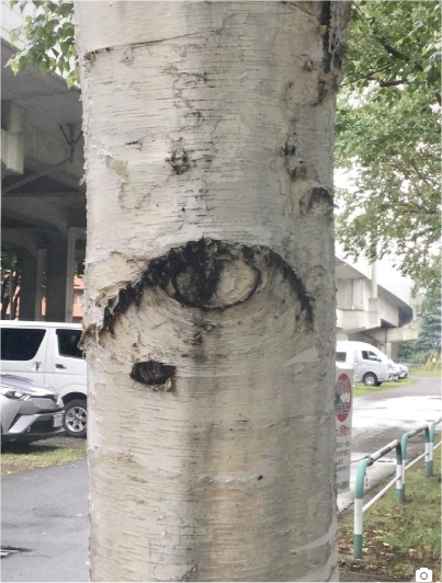 以上の写真から、国内のシラカバでも人間の"目玉"模様ができるようである。最初の写真は撮影者自身が"目玉"と意識して撮っている。