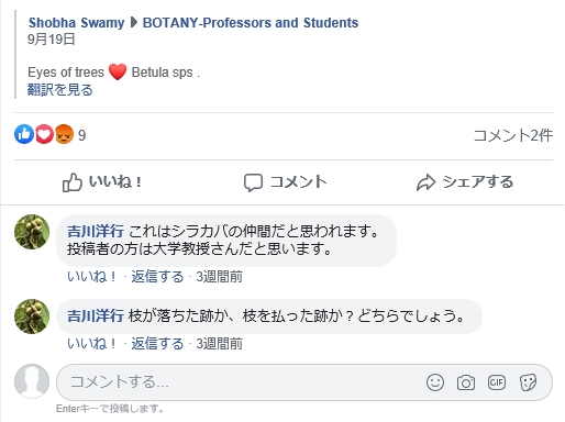 3.すると、この投稿へのコメントが多数あり、最初のコメントに「These are lenticels in bark of Betula」とあり、これに対して教授が「yes thank u」と返信している。他のコメントにも種名は出てこず、イラストと疑うものもなかった。