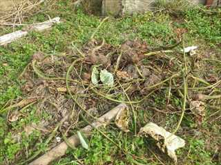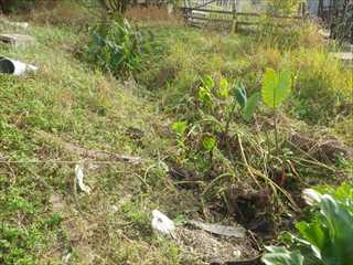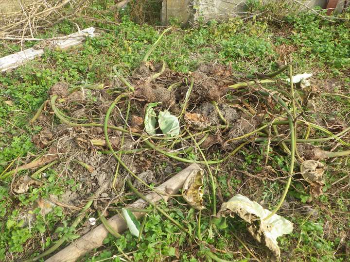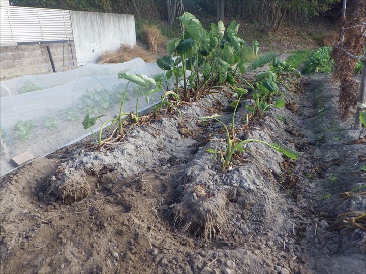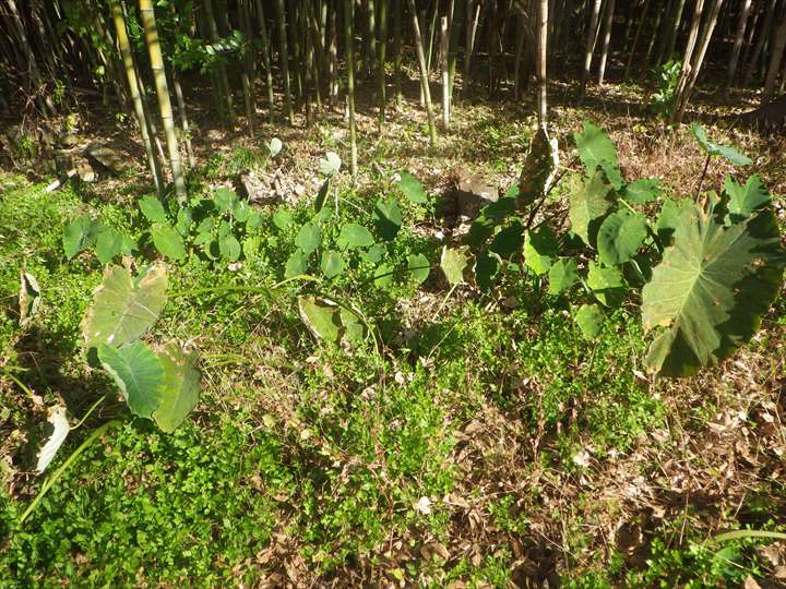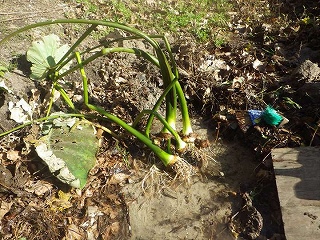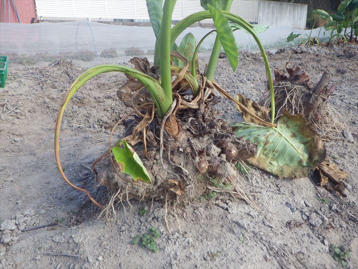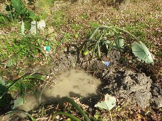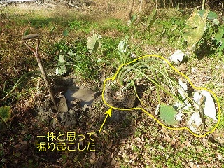 【右】[左]の場所から農業主が掘り起こした里芋を発見。大きめの子芋は食用のため摘み取られていた。しかし、その中で興味あるモノを発見…↓