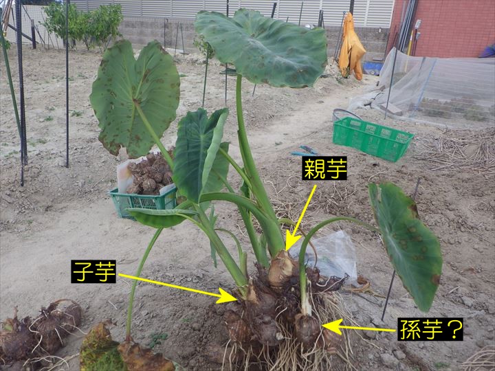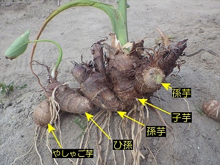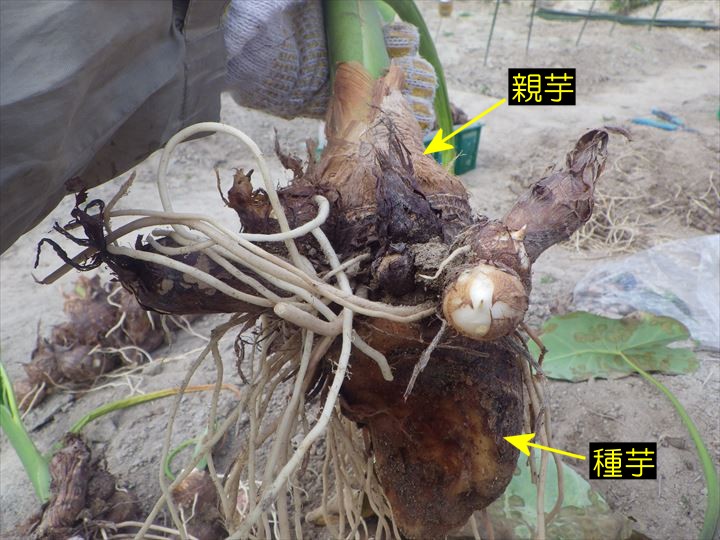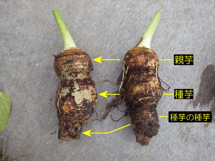 【左】これが興味あるモノ。即ち、典型的な「親芋は種芋の上に出来る」の図。"種芋の種芋"は、さすがに、半分以上腐っていて全体の姿は無い。