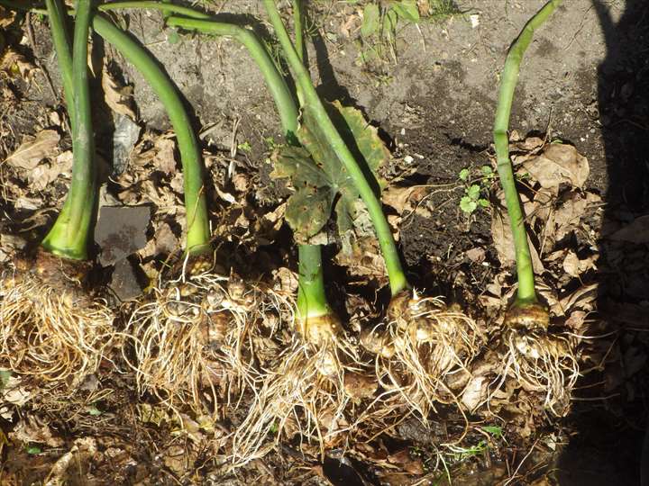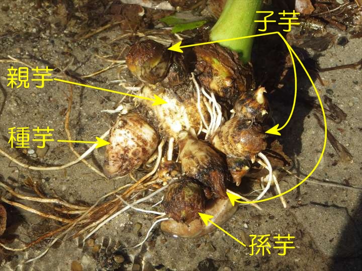 この自生種の親芋には子芋の影も無い。野生種はこのような状態であろうと推測。