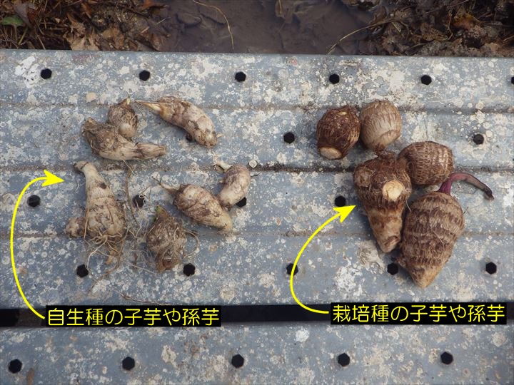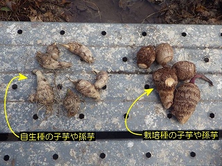 【右】子芋や孫芋の付き方や大きさにしても、自生種と栽培種との差は歴然。