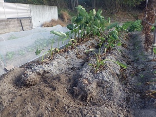 【左】S農場の里芋の畝(うね) 【右】一株掘り取ってくれていた…この土を払って…↓