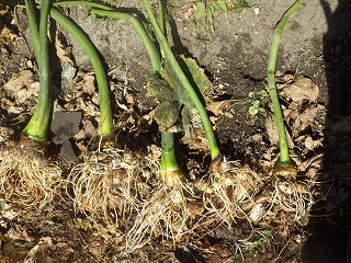 【右】[左]の5株の内の1株。この株だけ "孫株" が確認できた。種芋は、まだ、全体に固かった。