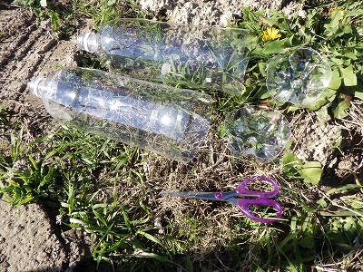 【左】1.5リットルの筒型ペットボトルの底を切り取る 【右】掘った穴に口を下にして埋める…落とし穴の完成