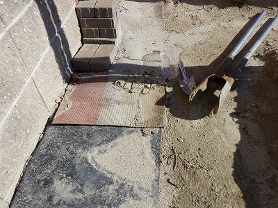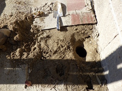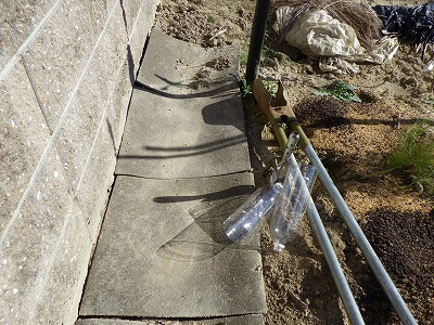 【左・右】畑の境界に住宅のブロック壁が有り、そこの防草シート(?)をめくると、明らかなモグラの通路がある