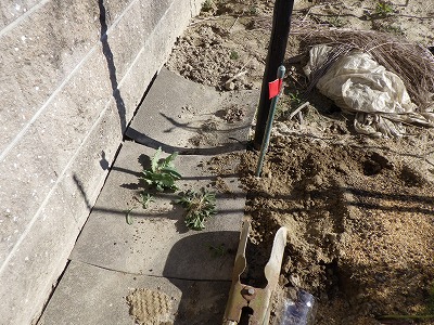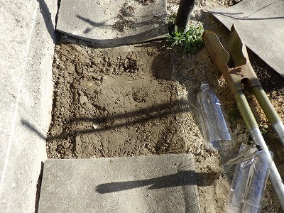 【左】移植ごてで掘って、ペットボトルを入れて完成 【右】忘れないと思うが、念のため "マーク" を立てる