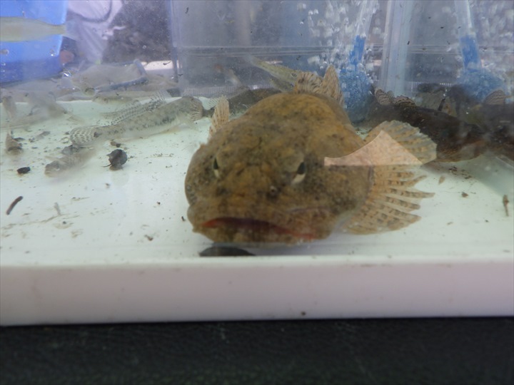 【左】水槽の中で泳ぐアユカケ 【右】水槽の中のアユカケ。ほぼ、正面から撮る