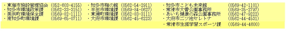 | 42 | 20 | 8 | 1 | 土 | × | 知多 | 「企業緑地の生きもの」●知多市環境政策課 | JATGエネルギー(株) 9:30 | 野村(0562-55-4122) |